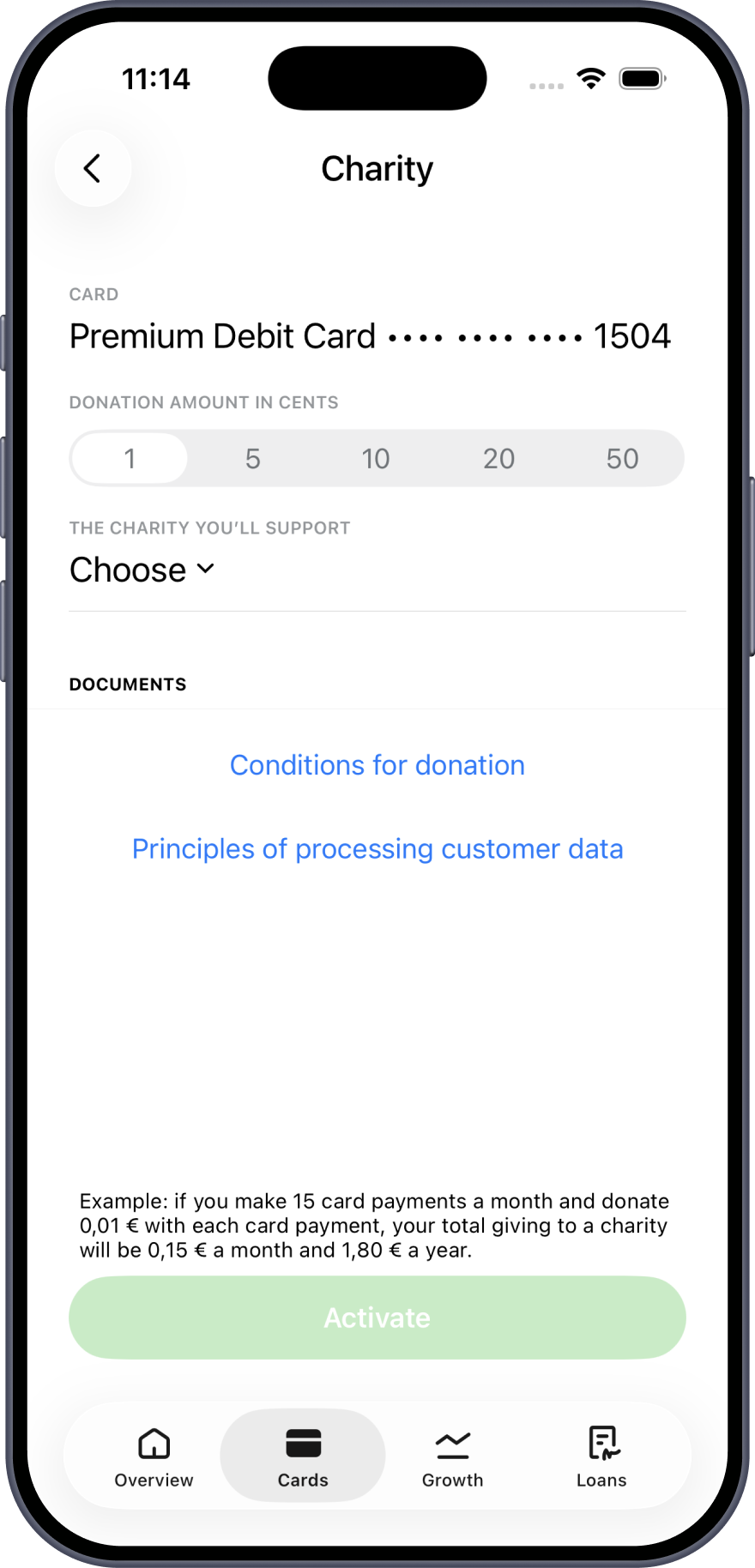 With an active debit card, you can turn donation on or off in the LHV mobile app or in the internet bank. You should also choose how much and to which charity you donate with each card payment.