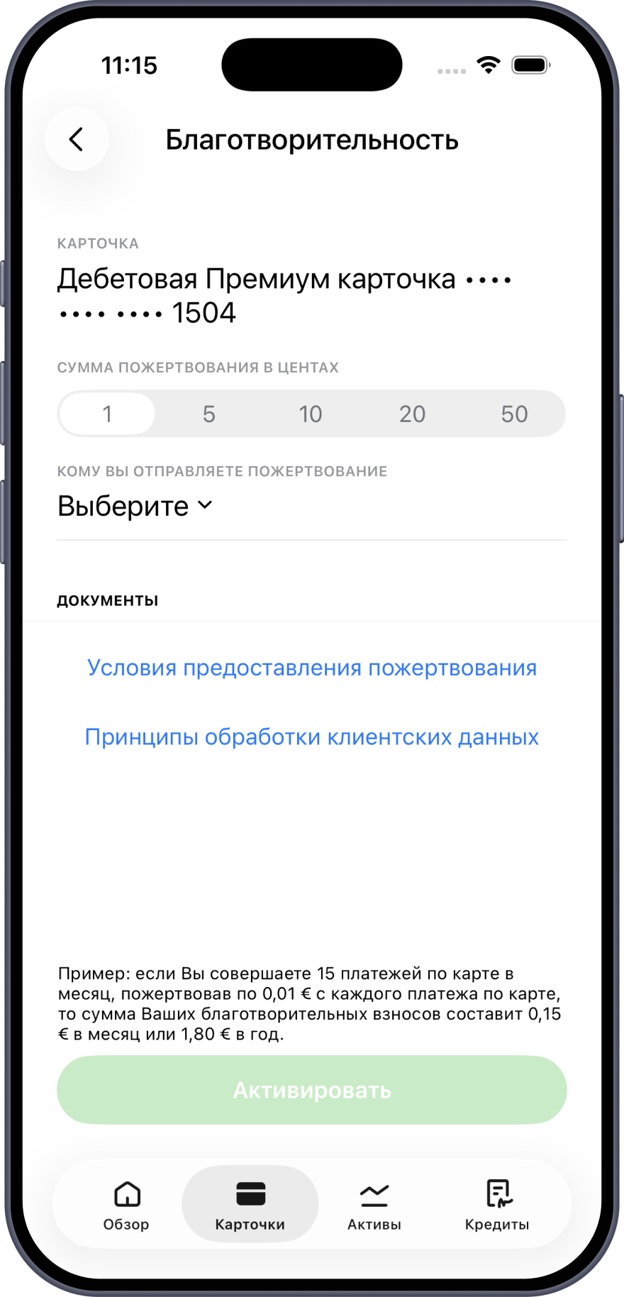 Вы можете включить или отключить постоянное пожертвование для активной дебетовой карты в мобильном приложении или интернет-банке LHV. При этом выберите, какую сумму и какой организации Вы жертвуете при оплате картой.